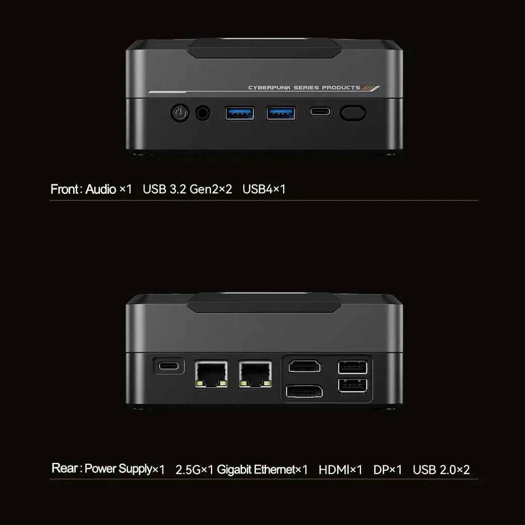 Front I/O: 2 x USB3.2(10Gbps), 1 x Type-C USB4.0 thunderbolt 4(40Gbps, support eGPU, 8K display), 1 x Audio, 1 x Switch